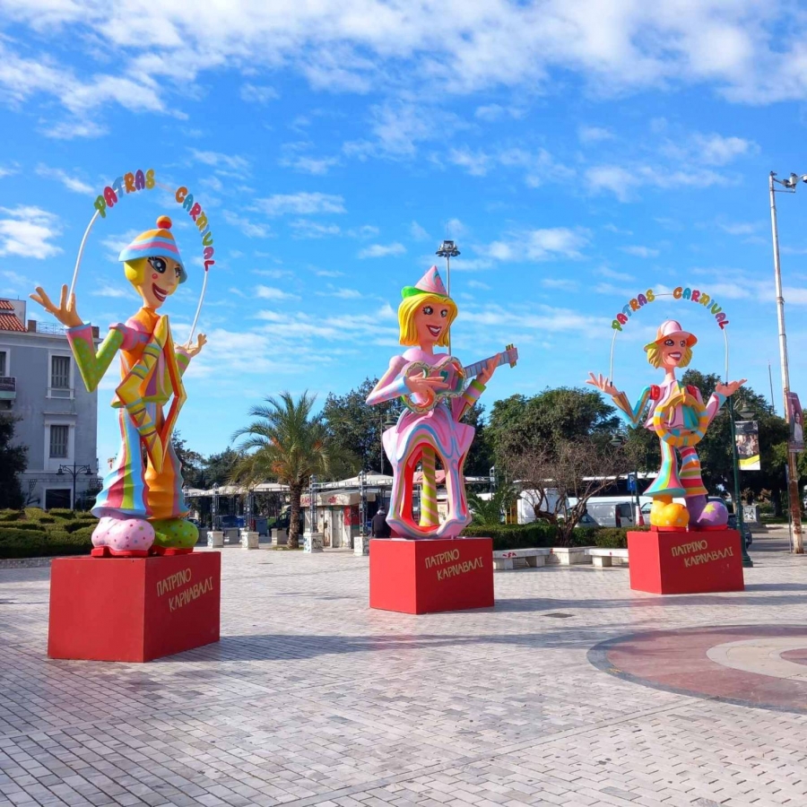 Ήδη από το πρωί η πλατεία Τριών Συμμάχων μεταμορφώθηκε αποκτώντας μια εξαιρετική όψη με τα εντυπωσιακά στοιχεία που τοποθετήθηκαν. Τα ολοκαίνουρια καρναβαλικά στοιχεία της πλατείας Τριών Συμμάχων χαρακτηρίζονται από μια σύγχρονη και γεμάτη φρεσκάδα αισθητική. Πρόκειται για 5 νέα καρναβαλικά στοιχεία-πολύχρωμες φιγούρες, εκ των οποίων η μία παριστάνει μια γυναίκα που παίζει κιθάρα και οι τέσσερις υπόλοιπες είναι κλόουν που στα χέρια τους «κρατούν καλά» το Πατρινό Καρναβάλι («Patras Carnival») στήνοντας όλες μαζί έναν χορό εξωστρέφειας, χαράς, λάμψης, χρώματος, κίνησης και αισιοδοξίας. Οι λουσμένες στο φως φιγούρες βασίστηκαν στα σχέδια του Πατρινού εικαστικού καλλιτέχνη και τεχνίτη Γιώργου Καράβολα, γνώστη της τεχνοτροπίας του Καρναβαλικού Εργαστηρίου, που παραχωρήθηκαν δωρεάν στην ΚΕΔΗΠ-Καρναβάλι Πάτρας. Τα σχέδια πήραν μορφή από τον Δημήτρη Ντζουμάνη και επιζωγραφήθηκαν από τον Γιώργο Μπαμπίλη του Καρναβαλικού Εργαστηρίου του Δήμου Πατρέων.