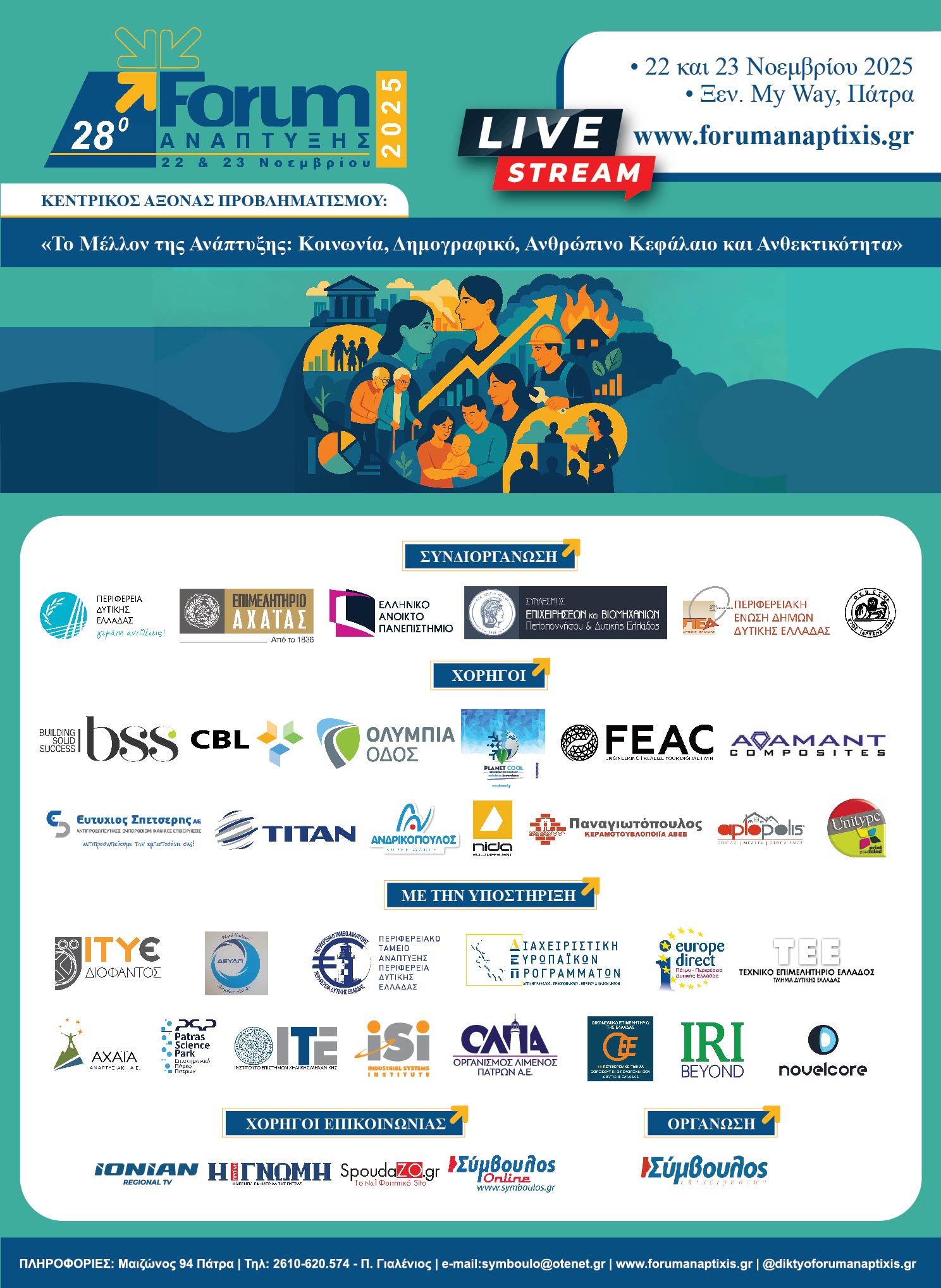 Το 28ο Forum Ανάπτυξης επιστρέφει δυναμικά στις 22 & 23 Νοεμβρίου 2025, στο ξενοδοχείο My Way στην Πάτρα, συνεχίζοντας τη μακρόχρονη πορεία του ως ένας από τους σημαντικότερους θεσμούς δημόσιου διαλόγου για την ανάπτυξη και την κοινωνική πρόοδο.