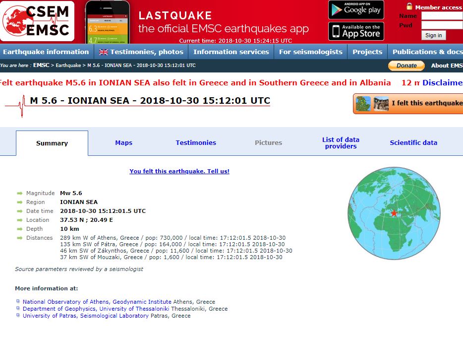 Σύμφωνα με το Ευρωμεσογειακό, ο σεισμός που σημειώθηκε είχε ένταση 5,6 Ρίχτερ.
