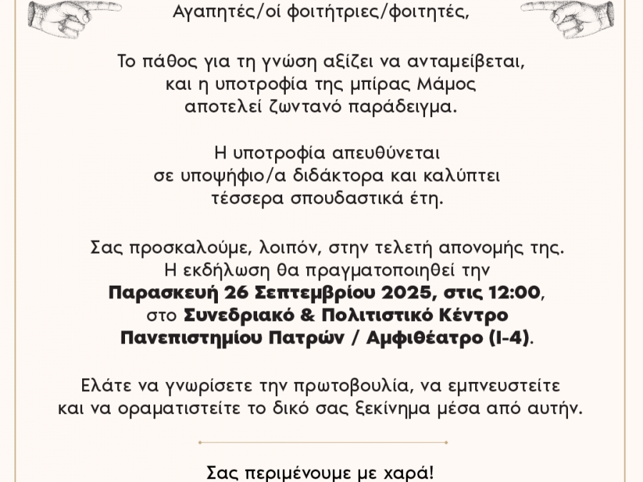 Την Παρασκευή 26.09.2025 και ώρα 12.00, στο Συνεδριακό και Πολιτιστικό Κέντρο του Πανεπιστημίου Πατρών, θα πραγματοποιηθεί εκδήλωση της επίσημης παρουσίασης της Υποτροφίας «ΜΑΜΟΣ» προσφορά της Αθηναϊκής Ζυθοποιίας Α.Ε. |